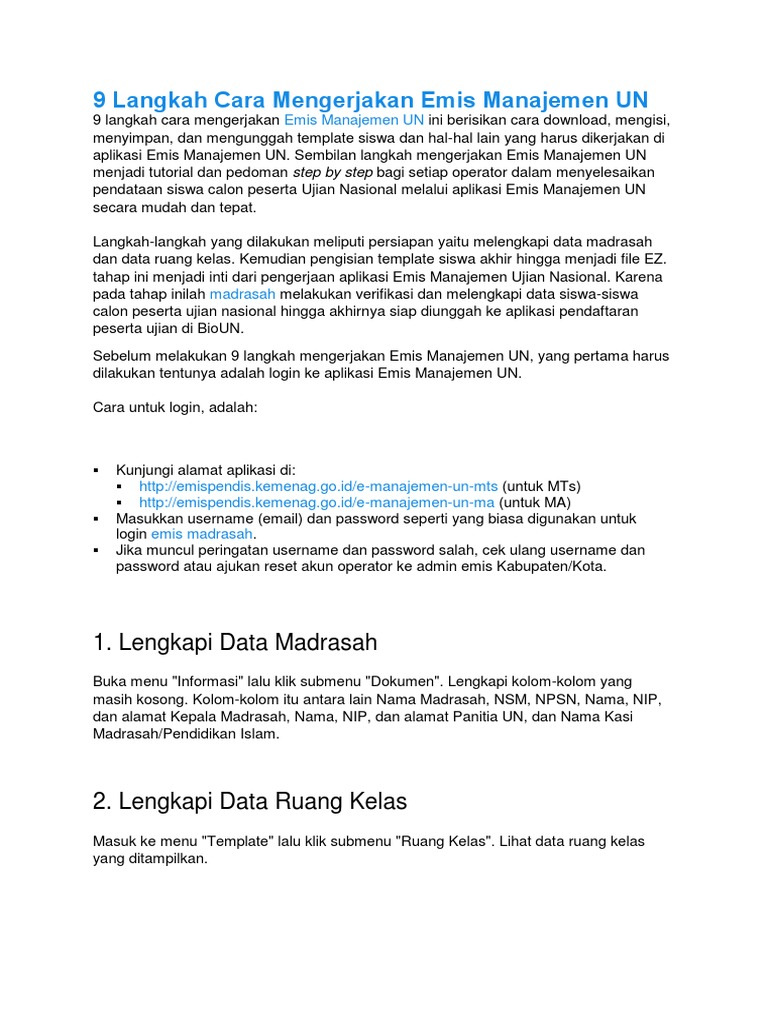 Dalam berbagai forum diskusi operator madrasah banyak yang mengeluhkan mengapa aplikasi emis manajemen un sangat sulit sekali diakses. Sembilan langkah mengerjakan emis manajemen un menjadi tutorial dan pedoman step by step bagi setiap operator dalam menyelesaikan pendataan siswa calon peserta ujian nasional melalui aplikasi emis. Fitur informasi, meliputi nama madrasah, nsm, npsn, nama kamad, nip, alamat, nama panitia un, nip, alamat, nama kasi madrasah/pendidikan islam dan nip. Dec 06, 2018 · alternatif link emis manajemen un mts ma. Berikut ini alternatif link emis manajemen un mts ma Cara unduh dan upload file.dz ke dalam bioun sd/mi (pendataan …. Silahkan melanjukan pendataan pada aplikasi terbaru di laman emis 4.0. Ditulis oleh harian madrasah desember 06, 2018 tambah komentar.